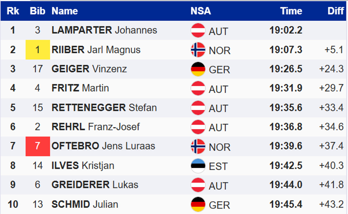На останньому колі дистанції Лампартер розібрався з лідером загального заліку Кубку світу, норвежцем Ярлом Магнусом Ріібером, який у підсумку фінішував на другій позиції. Топ-3 замкнув господар змагань, німець Вінценц Гайгер. Йому вдалося прорватися на подіум після 17 місця в стрибковій спробі.