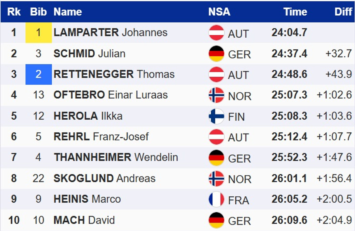 Як і у п'ятничному компакті, другим став німець Юліан Шмід. Топ-3 замкнув ще один представник Австрії, Томас Реттенеггер.