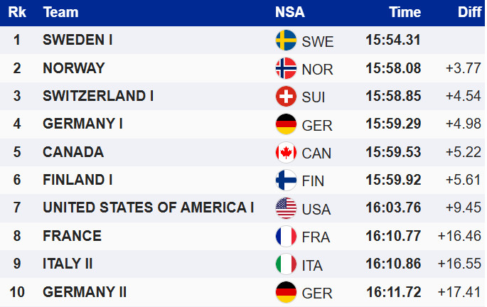 Перемогу здобув норвезький дует Пол Гульберг/Йоханнес Клебо, який випередив господарів, команду Швейцарії (Янік Ріблі/Валеріо Гронд). У боротьбі за бронзу шведи (Йохан Хагстрьом/Едвін Ангер) завдяки фотофінішу випередили Італію (Елія Барп/Федеріко Пеллегріно).