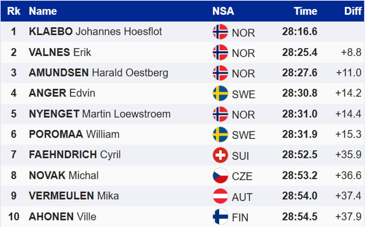 У розділці Клебо на 8,8 секунди випередив свого партнера по команді, Еріка Вальнеша, який пропускав спринт через травму спини. Бронзу завоював ще один представник Норвегії, Харальд Остберг Амундсен.