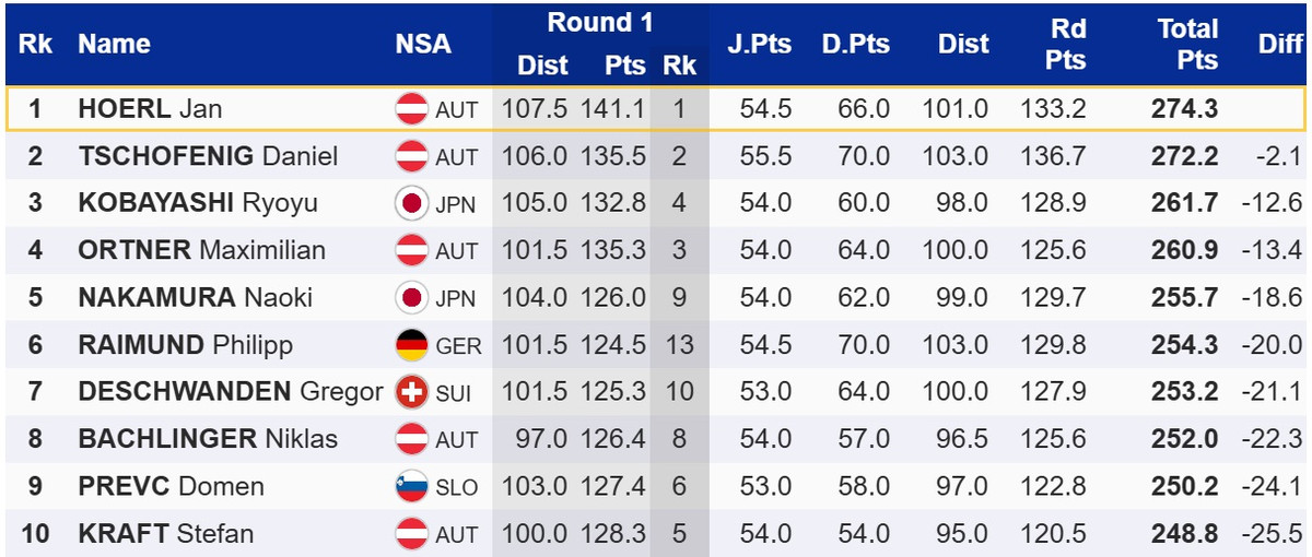 Турнір завершився переможним дублем збірної Австрії: виграв Ян Хьорль, який випередив Даніеля Чофеніга. Компанію на подіумі їм склав зірковий японець Рьою Кобаясі.
