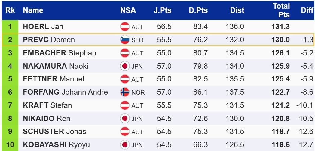 Виграв першу спробі австрієць Ян Хьорль, який всього на 1,3 бала випереджає лідера загального заліку Кубку світу, Домена Превца. Топ-3 замикає ще один австрієць, Штефан Ембахер. Лідер збірної Японії, Рьою Кобаясі, лише замикає топ-10.