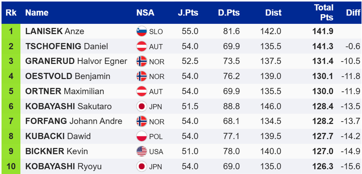 Виграв першу спробу словенець Анже Ланішек, який на 0,6 бала випереджає лідера загального заліку Кубку світу, австрійця Даніеля Чофеніга. Топ-3 замкнув норвежець Халвор Егнер Гранеруд.