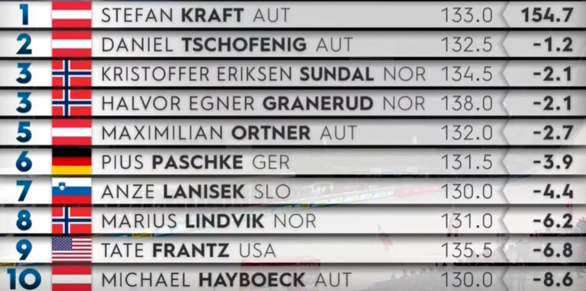 Першу спробу виграв чинний володар Кубка світу, австрієць Штефан Крафт. Він випередив партнера по команді, Даніеля Чофеніга, а також господаря змагань, норвежця Халвора Егнера Гранеруда.