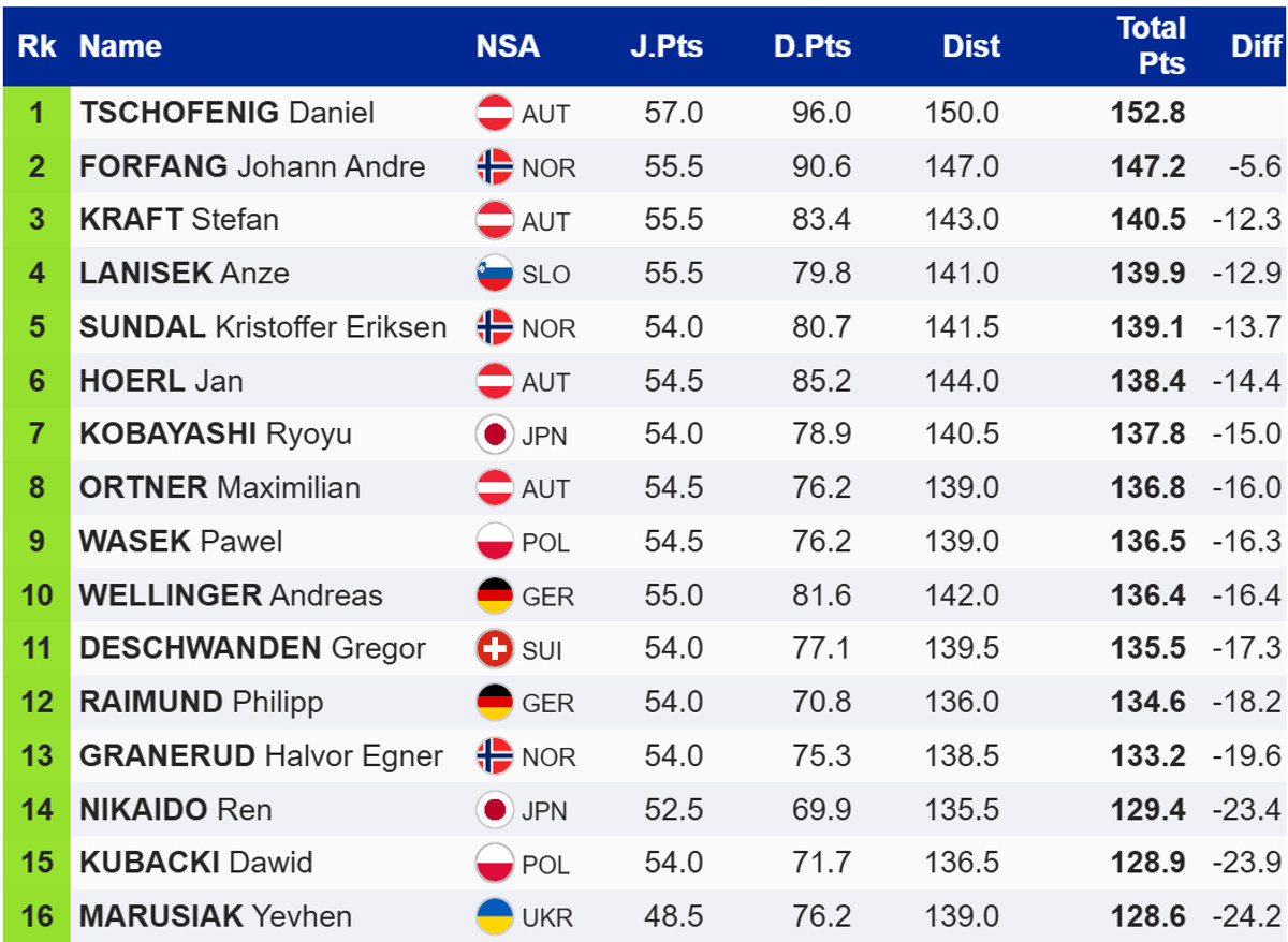 Виграв першу с пробу лідер загального заліку Кубку світу, австрієць Даніель Чофеніг, який вчора виграв иер. Він на 5,6 бала випереджає норвежця Йоханна Андре Форфанга. Топ-3 замикає ще один австрієць Штефан Крафт.