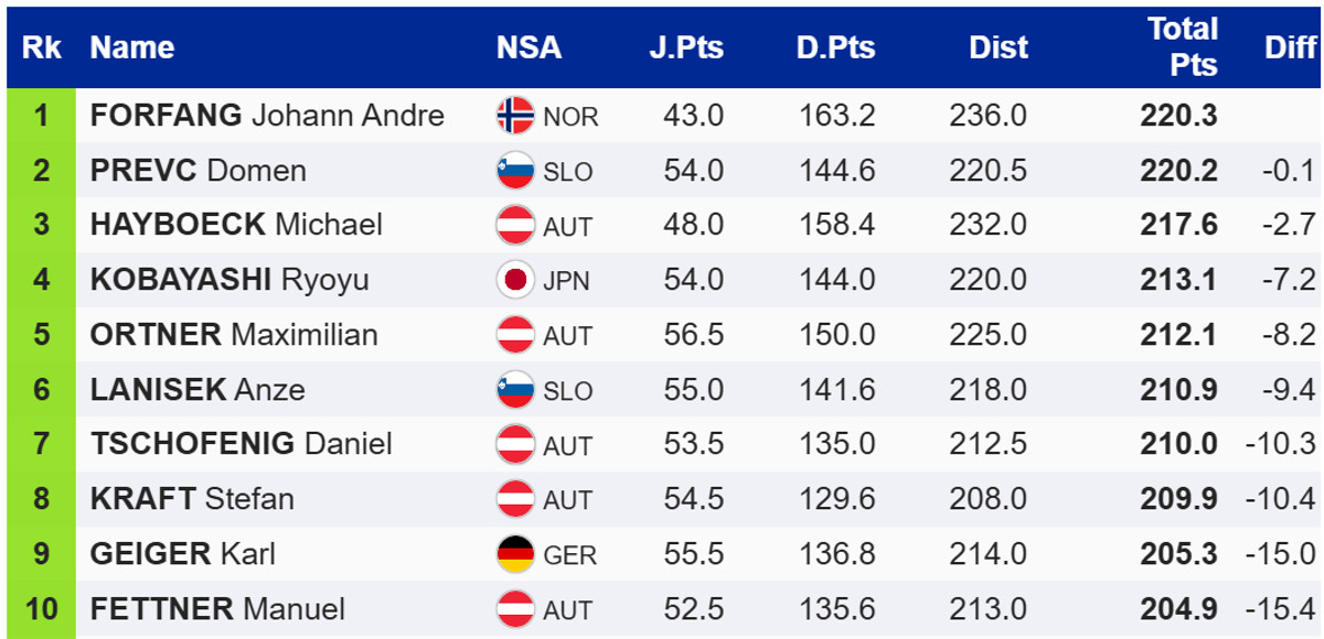 Переміг у кваліфікації норвежець Йоханн Андре Форфанг, який випередив словенця Домена Превца та австрійця Міхаеля Хайбьока.