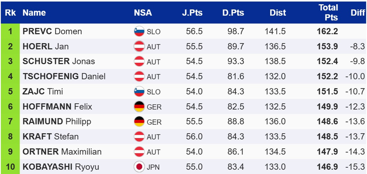 Виграв першу спробі лідер загального заліку Кубку світу, словенець Домен Превц. Він випереджає трьох представників Австрії – Яна Хьорля, Йонаса Шустера та Даніеля Чофеніга.