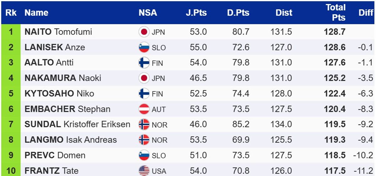 Виграв першу спробі японець Томофумі Наїто. Він випереджає словенця Анже Ланішека та фіна Антті Аалто. Зазначимо, що перша спроба проходила за складних вітрових умовах, німець Філіпп Раймунд відмовився виходити на старт із міркувань безпеки.