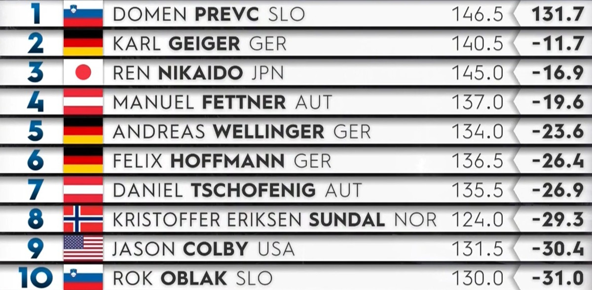 Виграв першу спробу лідер Кубку світу, словенець Домен Превц. Він на 11,7 бала випереджає господаря змагань, німця Карла Гайгера. Топ-3 замикає японець Ренн Нікайдо.