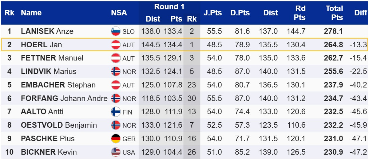 Перемогу здобув його партнер по збірній Словенії, Анже Ланішек. Компанію на подіумі йому склали два австрійці – Ян Хьорль і Мануель Феттнер.