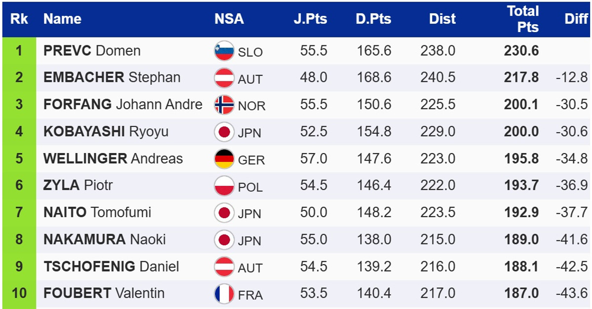 Виграв першу спробу лідер загального заліку Кубку світу, словенець Домен Превц, який на 12,8 бала випереджає австрійця Штефана Ембахера. Топ-3 замикає норвежець Йоханн Андре Форфанг.