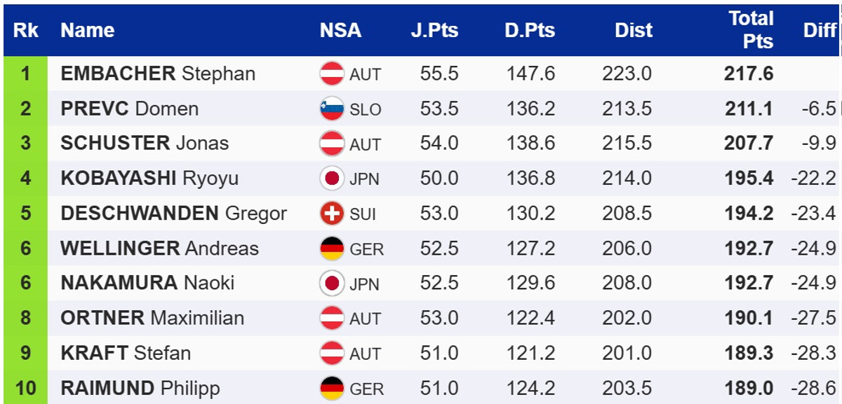 Виграв першу спробу господар змагань, австрієць Штефан Ембахер, який випереджає лідера загального заліку Кубку світу, словенця Домена Превца, та свого партнера по команді Йонаса Шустера.