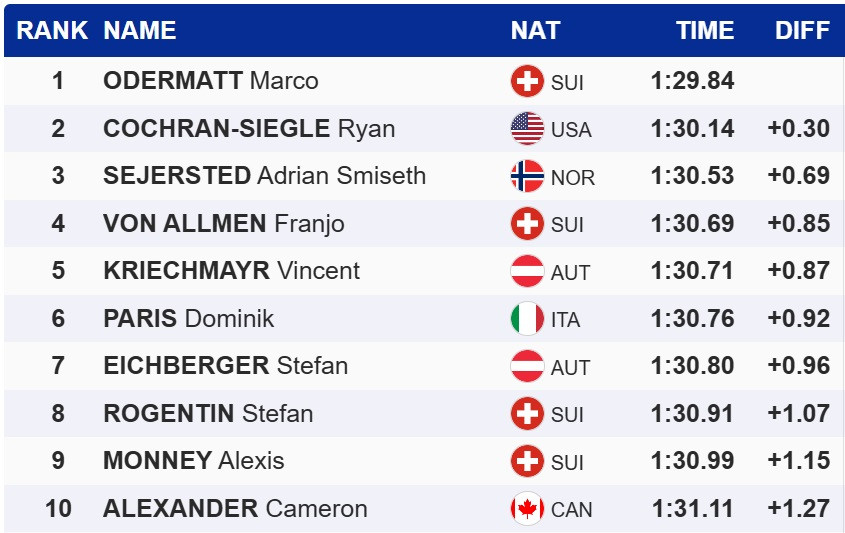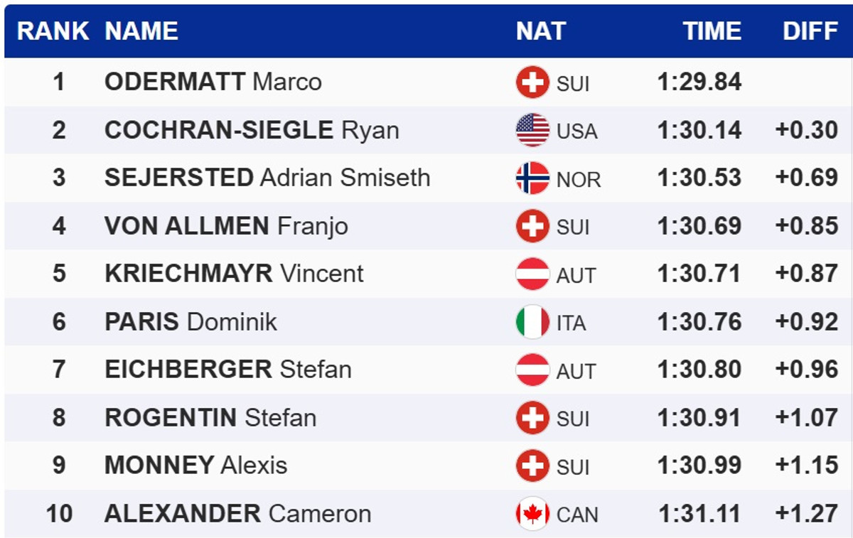 Одерматт на 0,30 секунди випередив господаря змагань, американця Раяна Кокрана-Зігле. Топ-3 замкнув норвежець Адріан Смізет Сеєрштед.