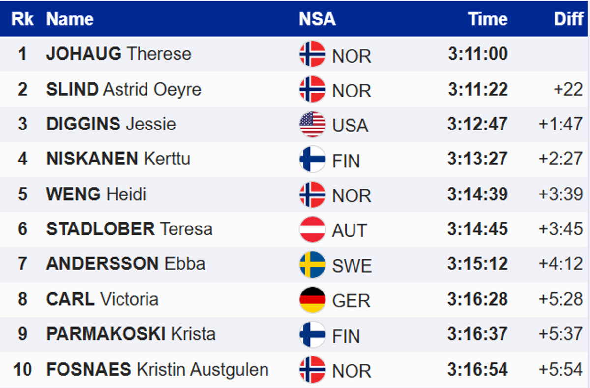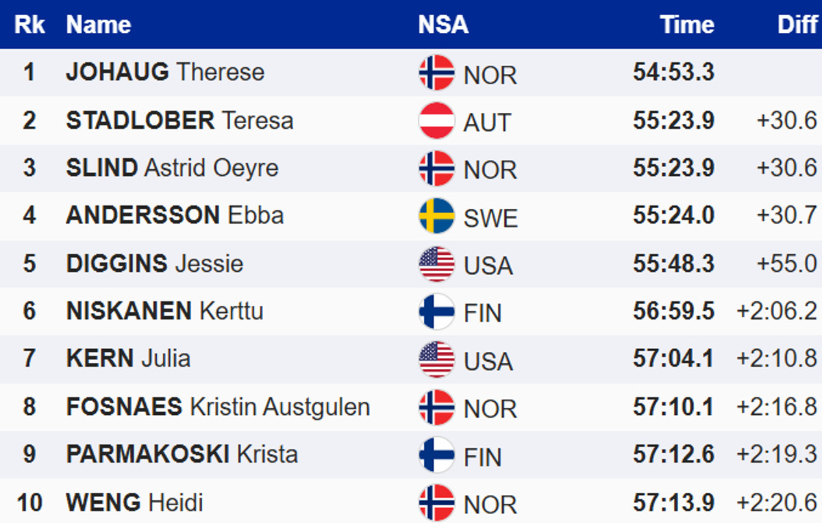 Йохауг на 30 секунд випередила групу найближчих переслідувачів – австрійку Терезу Штадлобер, норвежку Астрід Слінд і шведку Еббу Андерссон. Це дозволило Терезі перехопити у Слінд золоту майку лідера загального заліку.