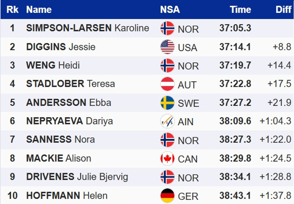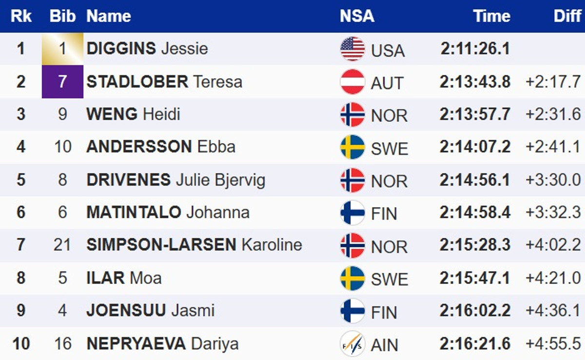 Американська лижниця Джессіка Діггінс стала переможцем багатоденки Тур де Скі-2025/26. Для неї це третя в кар'єрі перемога в загальному заліку Тур де Скі – раніше вона вигравала багатоденку в 2021 і 2024 роках.