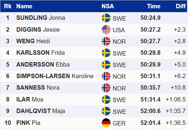Шведська лижниця Йонна Сундлінг виграла масстарт на 20 км вільним стилем на етапі Кубку світу в фінській Руці. У фінішному спринті вона на 2,3 секунди випередила американку Джессіку Діггінс. Топ-3 замкнула норвежка Хейді Венг.