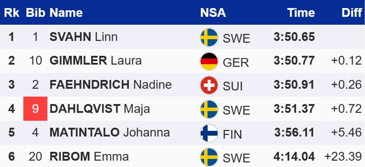 У жінок свою першу перемогу в поточному сезоні здобула шведка Лінн Сван. Вона у фіналі випередила німкеню Лауру Гіммлер і швейцарку Надін Фендріх. Збірна України сьогоднішній спринт пропускала.