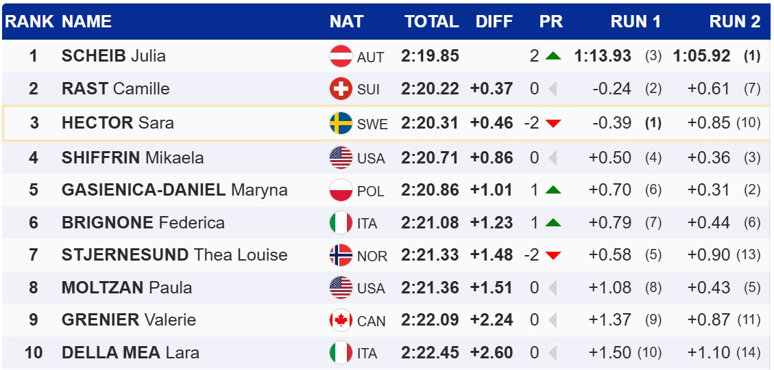 Сьогодні Шайб на 0,37 секунди випередила швейцарку Каміль Раст. Топ-3 замкнула шведка Сара Хектор, яка не зуміла втримати лідерство після першої спроби.