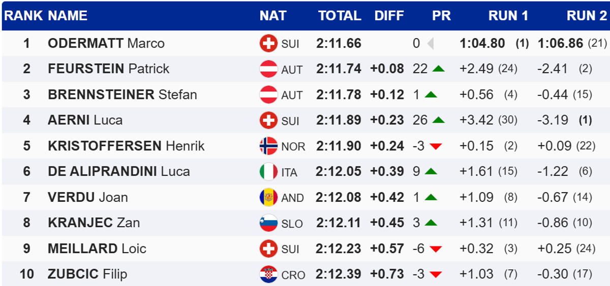 Одерматт випередив двох австрійців – Патріка Фойрштайна та Штефана Бреннштайнера. Фойрштайн у другій спробі здійснив прорив з 24 місця після першого заїзду. З 30-ї позиції на четверту прорвався швейцарець Лука Ерні.