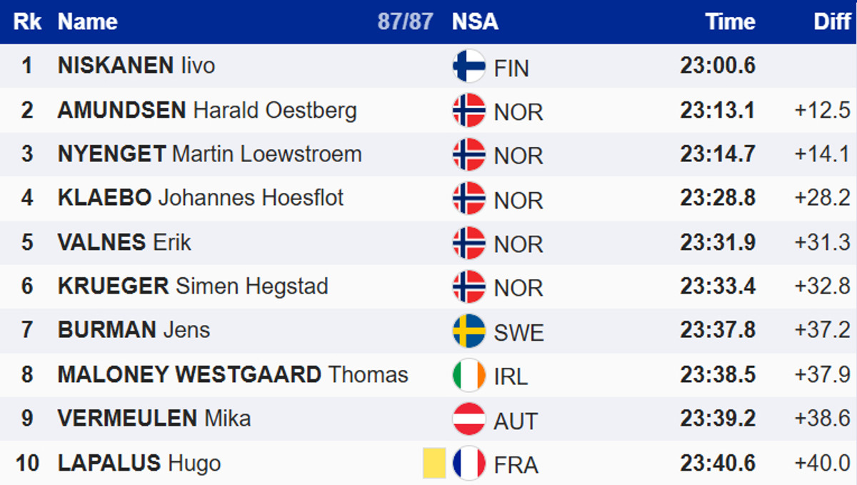 Топ-3 замкнув ще один представник Норвегії, Мартін Льовстрьом Ньєнгет. Зірковий Йоханнес Клебо фінішував лише четвертим, відставши від топ-3 на 14,1 секунди