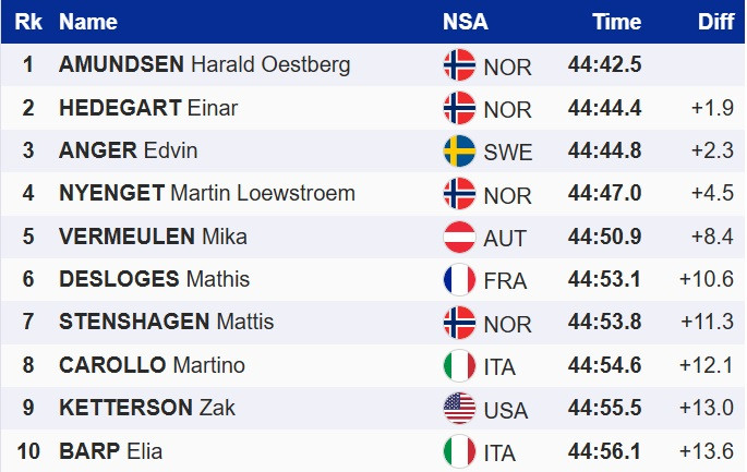 Топ-3 замкнув швед Едвін Ангер. Зірковий норвежець Йоханнес Клебо, який напередодні виграв спринт, фінішував лише 15-м із відставанням у 18,3 секунди.