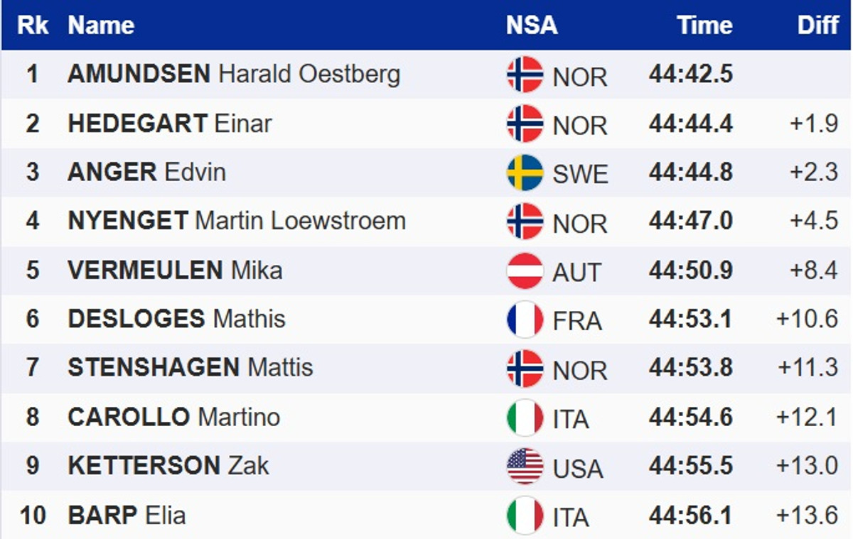 Топ-3 замкнув швед Едвін Ангер. Зірковий норвежець Йоханнес Клебо, який напередодні виграв спринт, фінішував лише 15-м із відставанням у 18,3 секунди.