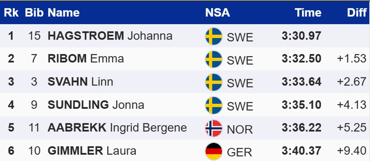 У жінок спринт завершився бенефісом збірної Швеції. Перемогу здобула Йоханна Хагстрьом, яка випередила Емму Рібом. Третє та четверте місця відповідно посіли Лінн Сван і Йонна Сундлінг, попри те, що обидві впали у фінальному забігу. Для Хагстрьом ця перемога стала другою в кар'єрі на Кубку світу.
