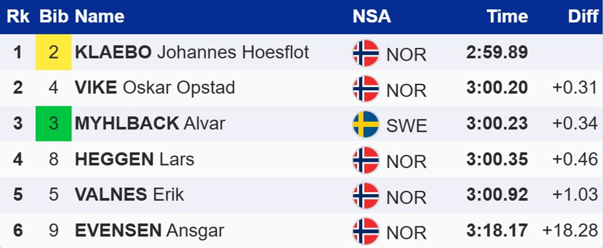 Норвезький лижник Йоханнес Клебо виграв спринт класикою на другому етапі Кубку світу в Тронхеймі. У фіналі він випередив свого партнера по команді Оскара Опстада Віке та шведа Альвара Мюльбака. Для останнього це перший у кар'єрі подіум на Кубку світу.