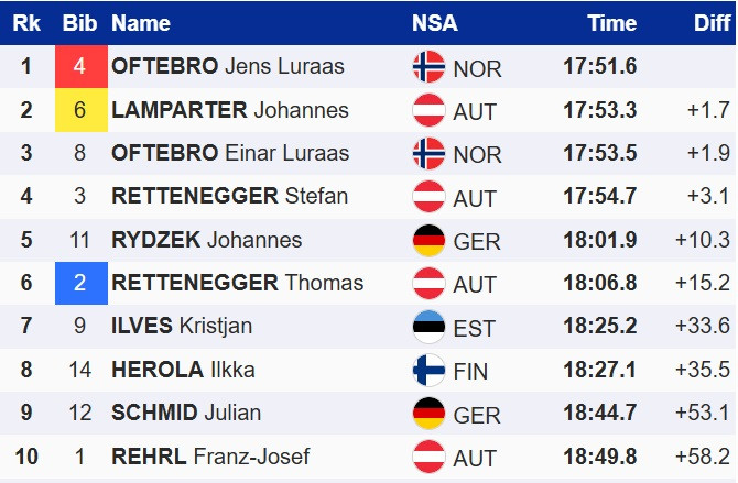 Офтебро стартував у гонці четвертим, і в підсумку випередив на фініші лідера загального заліку Кубку світу, австрійця Йоханнеса Лампартера. Топ-3 замкнув старший брат Офтебро, Айнар, який минулого тижня в Отепя здобув свою першу в кар'єрі перемогу на Кубку світу.