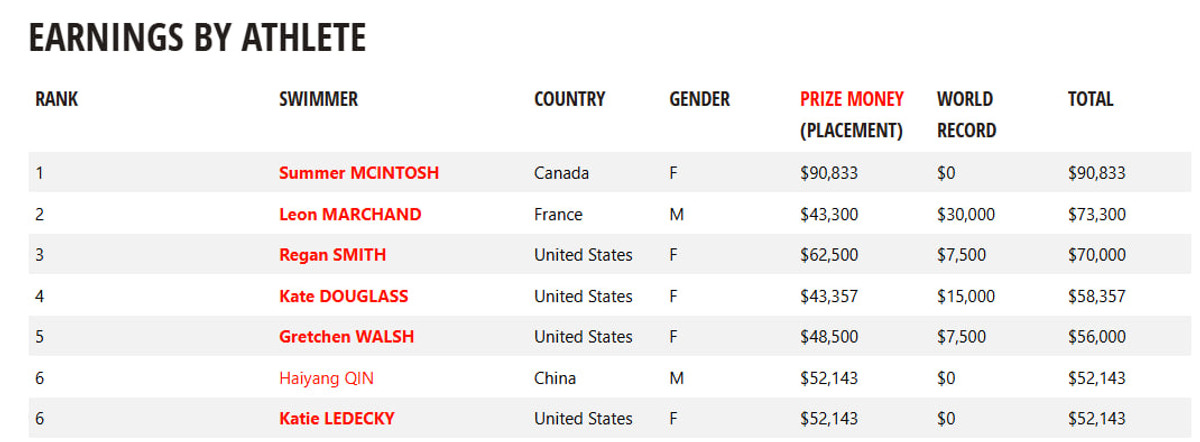 На другому місці серед спортсменів опинився Леон Маршан. Француз здобув дві перемоги, але отримав бонус у розмірі 30 тисяч доларів за світовий рекорд на 200 м комплексним плаванням.