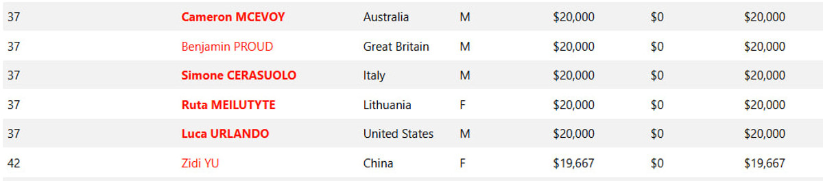 Легендарна Кеті Ледекі, яка за кар'єру виграла 9 "золотих" медалей Олімпійських ігор, заробила своїми виступами 52 143 долари і розділила 6-7 місце за призовими з китаянкою Хайянь Цінь.