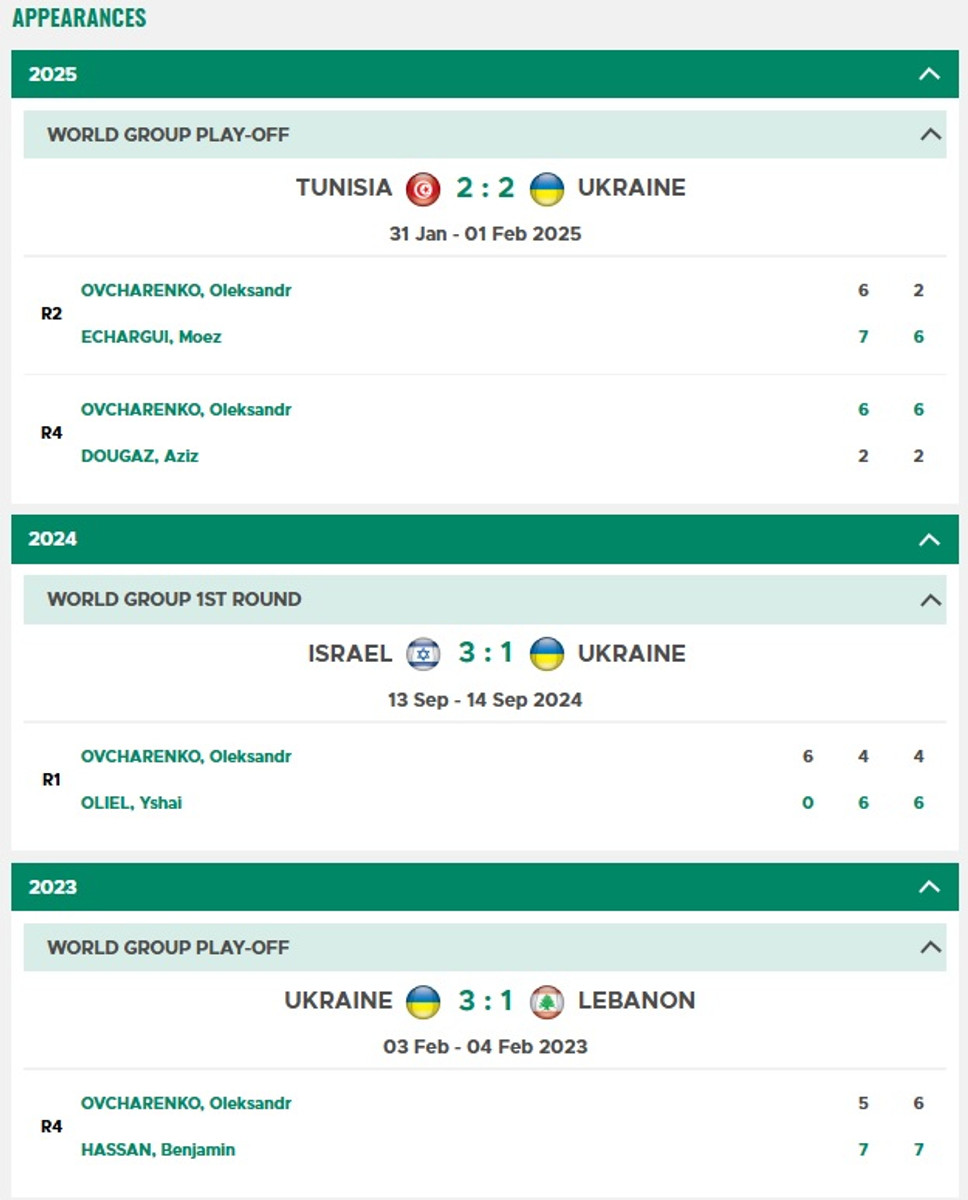 Зазначимо, що це був четвертий поєдинок Овчаренка у складі української команди. У 2023-му він програв ліванцю Бенжамену Хассану (5:7, 6:7), у 2024-му – ізраїльтянину Ішаю Оліелю (6:0, 4:6, 4:6), а в перший день протистояння з тунісцями поступився Моезу Ашаргі (6:7, 2:6).