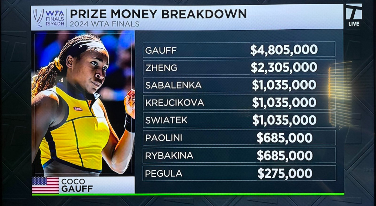 Американська тенісистка Коко Гофф завершила сезон яскравою перемогою на Підсумковому турнірі WTA в Ер-Ріяді, Саудівська Аравія, вигравши 4,8 мільйона доларів призових – найбільшу суму, яку коли-небудь отримувала тенісистка в одиночному турнірі WTA.
