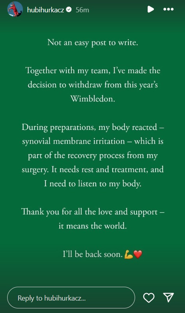 "Непросто писати такі речі. Разом зі своєю командою я ухвалив рішення знятися з цьогорічного Вімблдона. Під час підготовки моє тіло відреагувало – подразнення синовіальної оболонки – що є частиною процесу відновлення після операції.