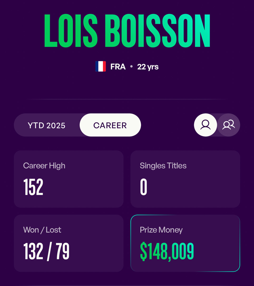 Тобто за 6 років професійної кар'єри Лоїс заробила у п'ять разів менше, ніж за два тижні виступів на головному турнірі Франції!