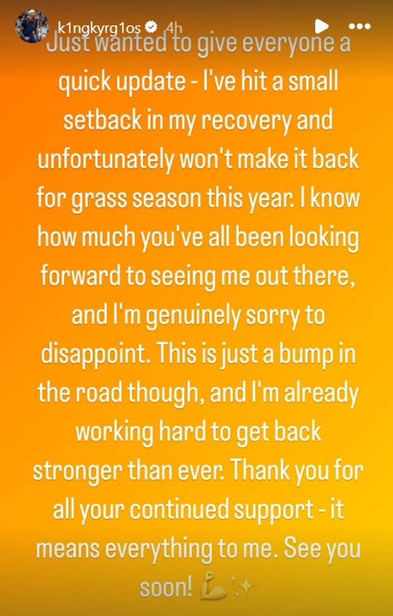 "Невелике оновлення: у моєму відновленні дещо пішло не так, і, на жаль, я не встигну повернутися до трав'яного сезону цього року. Знаю, як сильно ви всі чекали мого повернення на корт, і мені справді дуже шкода вас розчаровувати.