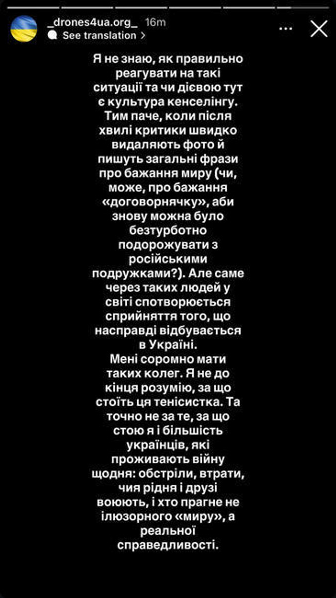 Мені соромно мати таких колег. Я не до кінця розумію, за що стоїть ця тенісистка. Але точно не за те, за що стою я і більшість українців, які проживають війну щодня: обстріли, втрати, чия рідня і друзі воюють, і хто прагне не ілюзорного "миру", а реальної справедливості".