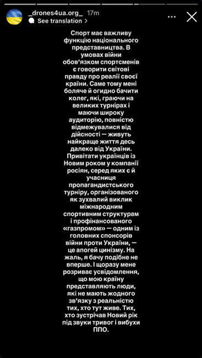 "Спорт має важливу функцію національного представництва. В умовах війни обов'язок спортсменів – говорити світові правду про реалії своєї країни. Саме тому мені боляче й огидно бачити колег, які, граючи на великих турнірах і маючи широку аудиторію, повністю відмежувалися від дійсності – живуть найкраще життя десь далеко від України.