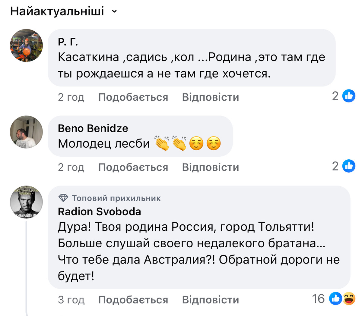 "Патріоти" стали наголошувати на тому, що батьківщина – це там, де ти народився і жоден паспорт це не змінить. Звісно ж, були і більш жорсткі речі на адресу Касаткіної. Її називали "дурепою", ставили емодзі зі щуром і просто засуджували.