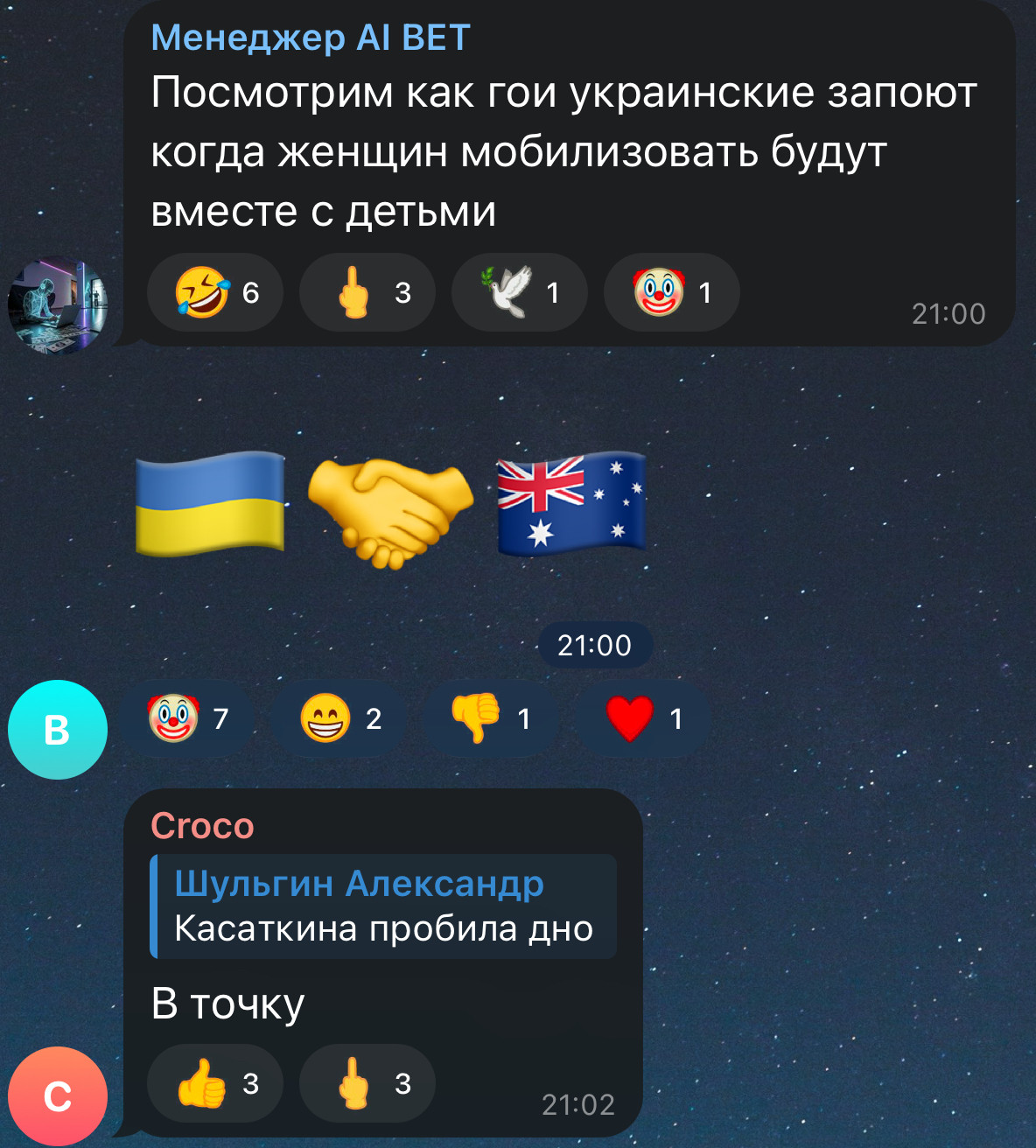 Користувачі телеграм-каналу у коментарях побажали усього найгіршого "зрадниці" Касаткіній, назвали Марту Костюк "нацисткою" і написали багато чого іншого.