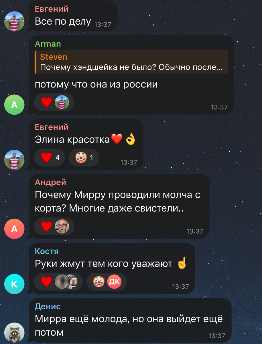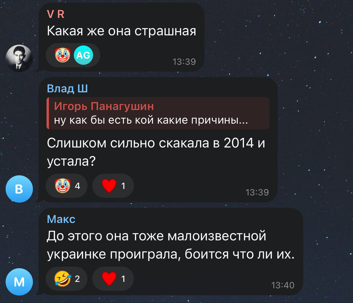 У коментарях росіяни писали, що Світоліна дійсно тенісистка топ-рівня, проти українок грати надзвичайно складно, і що російські спортсменки часто їм програють і вже відверто бояться таких матчів