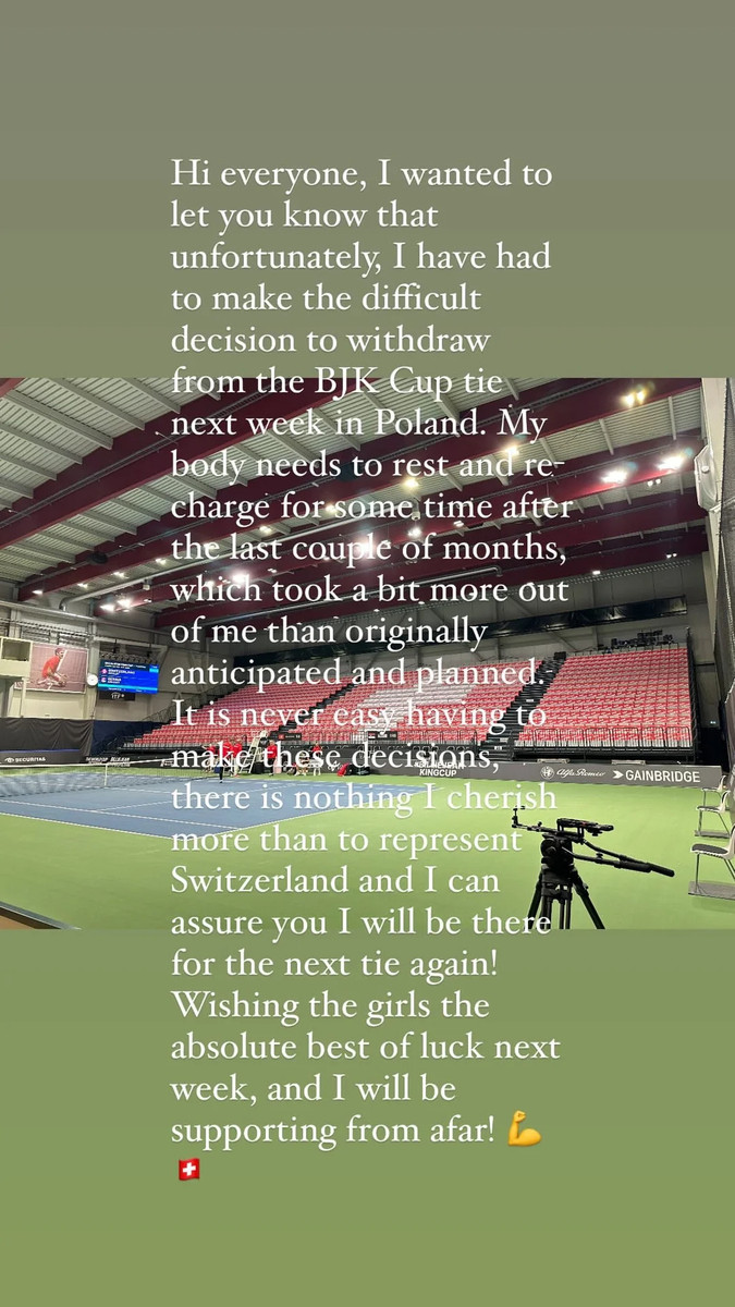 "Я хотіла повідомити вам, що, на жаль, мені довелося ухвалити важке рішення – знятися з матчу Кубка Біллі Джин Кінг наступного тижня в Польщі.
