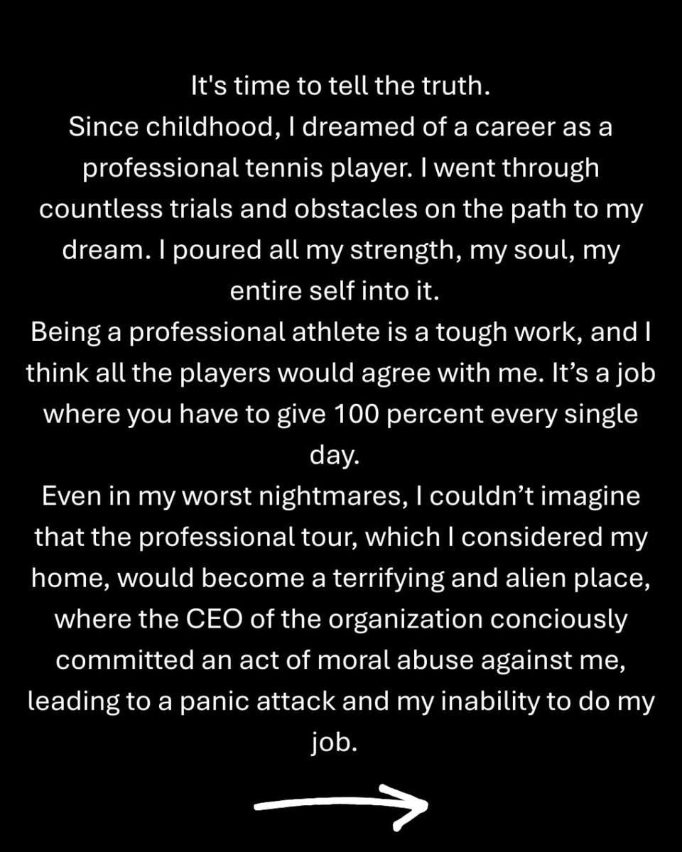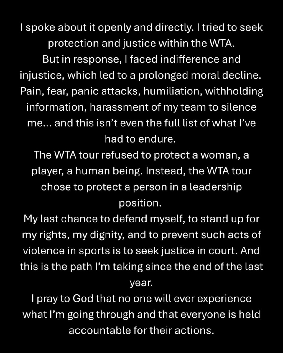 Я намагалася знайти захист і справедливість всередині WTA. Але у відповідь я зіткнулася з байдужістю і несправедливістю, що призвело до тривалого морального занепаду. Біль, страх, панічні атаки, приниження, приховування інформації, переслідування моєї команди, щоб змусити мене замовкнути... і це навіть не повний перелік того, що мені довелося пережити. WTA-тур відмовився захистити жінку, гравця, людину. Замість цього, WTA-тур вирішив захистити людину на керівній посаді.