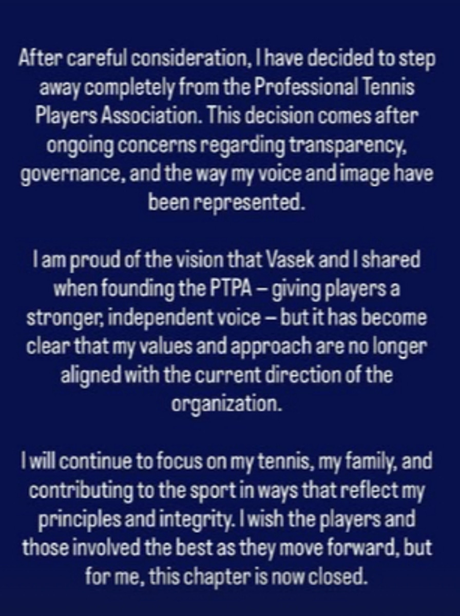 "Після ретельного обмірковування я ухвалив рішення повністю вийти з Асоціації професійних тенісистів (PTPA). Я вирішив так у зв'язку з постійними побоюваннями щодо прозорості, управління організацією і того, як представлені мій голос та імідж.
