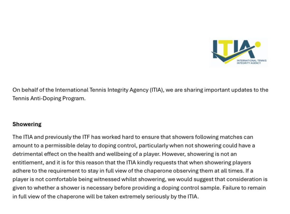 Міжнародне агентство із забезпечення чесності в тенісі (ITIA) розповсюдило оновлену інформацію щодо антидопінгових процедур, які стосуються відвідування душу після матчу.