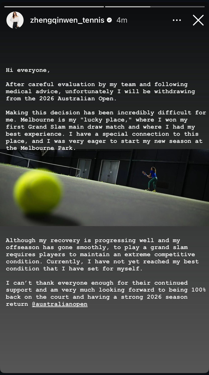 На поточний момент я ще не вийшла на той рівень фізичної готовності, який вважаю для себе необхідним. Щиро дякую всім за підтримку і з нетерпінням чекаю на момент, коли зможу повернутися на корт на 100% і провести сильний сезон-2026", – зокрема написала Ціньвень.