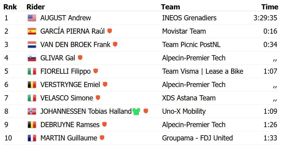 Заключний етап із відриву виграв американський гонщик команди Ineos Grenadiers Ендрю Огаст. Він випередив іспанця Рауля Гарсію П'єрну з Movistar і нідерландця Франка Ван ден Брука з Picnic PostNL.