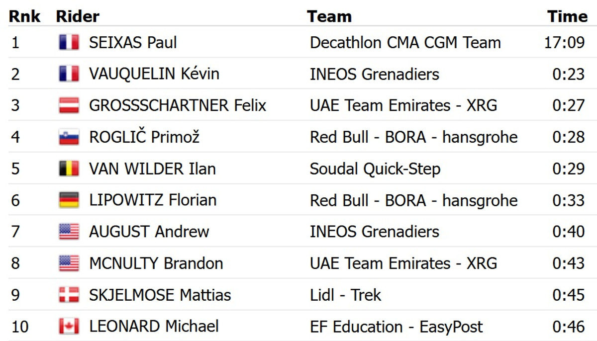 Сейксас на 23 секунди випередив свого співвітчизника, Кевіна Воклена з Ineos Grenadiers. Топ-3 замкнув австрієць Фелікс Гроссшартнер із UAE Emirates. Для 19-річного французького вундеркінда це перша в кар'єрі перемога на рівні Світового туру.