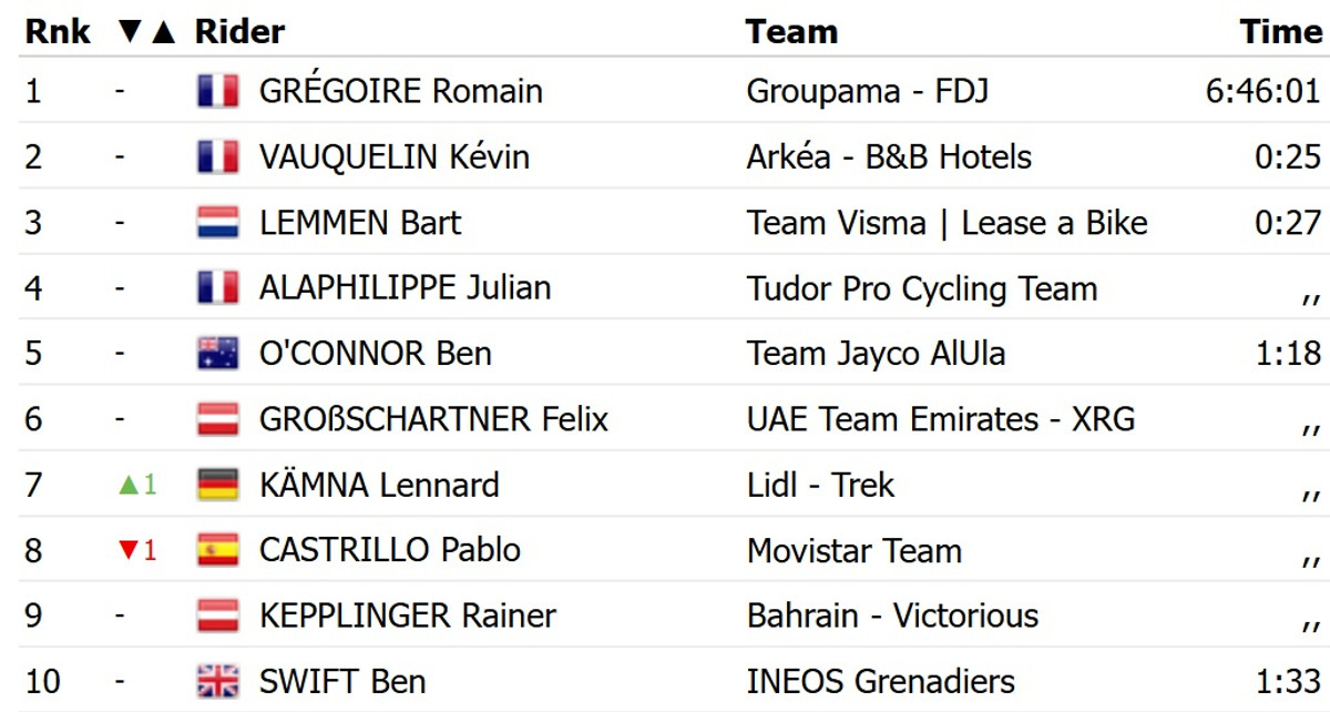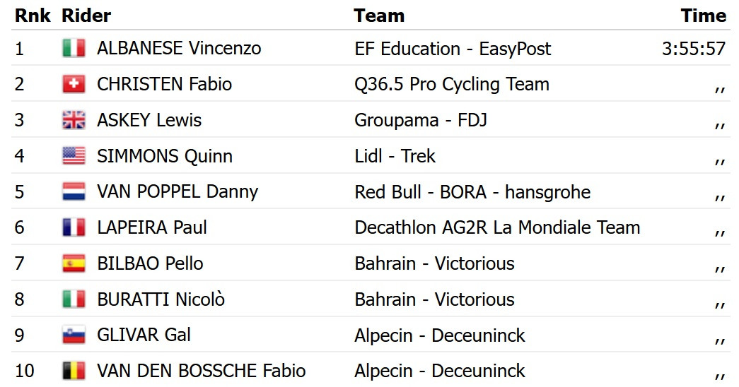 У фінішному спринті з основної групи Альбанезе випередив швейцарця Фабіо Крістена із команди Q36.5 і британця Льюїса Аскі з Groupama FDJ. Партнер останнього по команді Ромен Грегуар, який у неділю виграв перший етап, зберіг жовту майку лідера загального заліку.