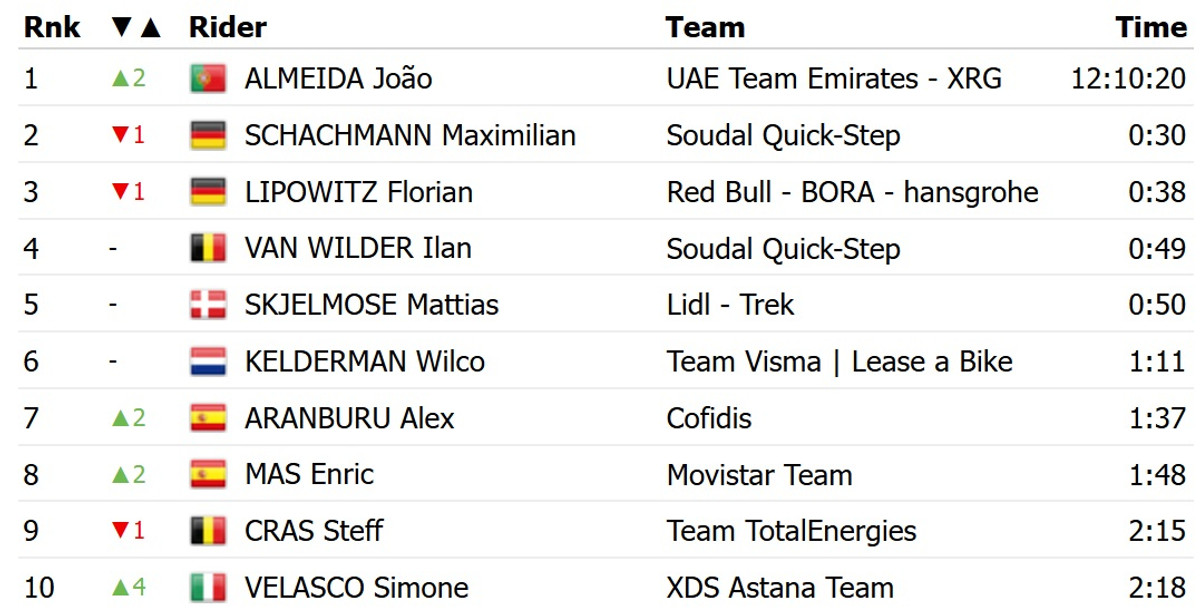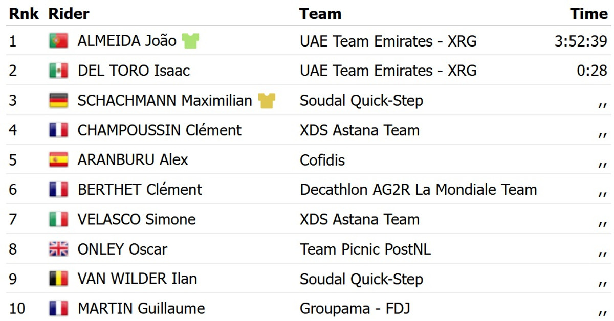 Алмейда переміг завдяки сольній атаці, випередивши на фініші групу переслідувачів на чолі з партнером по команді, мексиканцем Ісааком Дель Торо, та німцем Максімільяном Шахманном із Soudal Quick Step. Останній віддав Алмейді жовту майку лідера загального заліку.